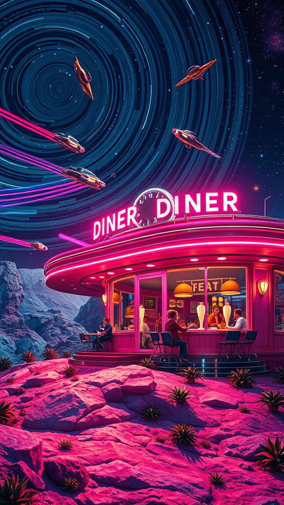 A vibrant retro sci-fi scene unfolds on an asteroid, where a classic 1950s-style diner, adorned with neon signs and chrome trimmings, sits under the swirling cosmos. Flying cars zip around in a mesmerizing ballet, casting dynamic beams of multicolored light that dance across the asteroid's rugged surface. The night sky is a canvas of twinkling stars and distant galaxies, creating a backdrop that is both infinite and intimate. Inside the diner, lively patrons in vintage futuristic attire savor milkshakes and burgers under radiant, multi-hued lights, their reflections shimmering in the large, curved glass windows. The asteroid’s surface is intricately detailed, with metallic platforms and lush alien flora adding depth to the scene, creating a dazzling, 4K realm where past and future merge seamlessly in vivid color.