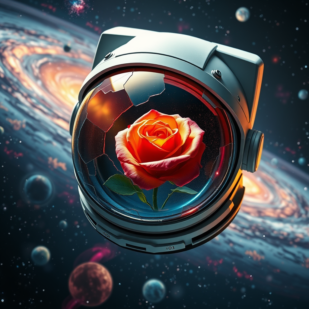 A vibrant rose blooming from the fractured visor of an astronaut's helmet floating in the vastness of space, surrounded by swirling galaxies and colorful nebulae, rendered in hyper-realistic detail with 8k octane clarity, luminous volumetric lighting, and HDR effects, capturing the surreal and striking contrast of life and technology in an ethereal cosmic scene, ratio 9:16.