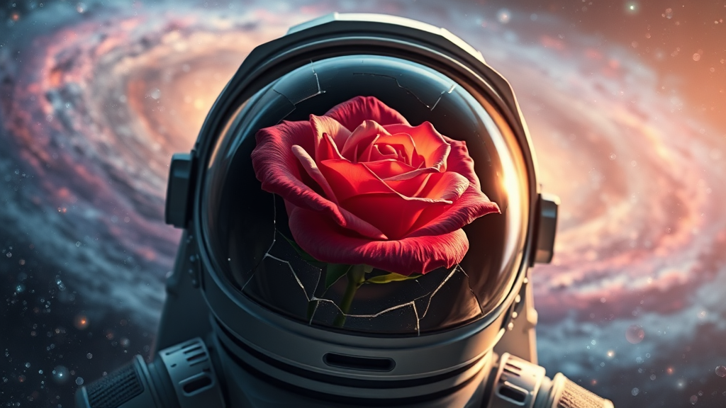 A vibrant rose blooming gracefully from the fractured visor of an astronaut's helmet, floating amidst the vastness of open space, surrounded by a swirling galaxy and colorful nebulae, photorealistic, ultra-detailed 8k render with volumetric lighting casting gentle glows, high dynamic range capturing the cosmic depth and brilliance, set in a striking 9:16 aspect ratio.