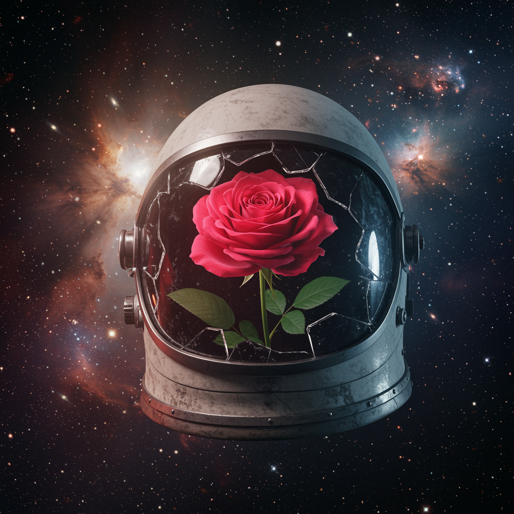 A vibrant rose blossoms from within a cracked astronaut helmet, floating freely in the vastness of space, surrounded by swirling galaxies and a luminous nebula. The scene is rendered in photorealistic detail, capturing every intricate petal and reflective surface of the helmet with hyper-realistic precision. Volumetric lighting casts ethereal glows across the cosmic environment, highlighting the vivid colors of the flower against the backdrop of a star-filled universe, captured in stunning 8k resolution, with an epic vertical composition.