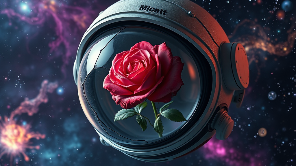 A vibrant rose flourishing within the cracked visor of an abandoned astronaut's helmet floating amidst the vastness of space, surrounded by swirling galaxies and colorful nebulas; hyper-realistic with intricate details captured in 8k resolution, illuminated by soft volumetric lighting, HDR rendering to highlight the subtle reflections and cosmic hues; aspect ratio 9:16.