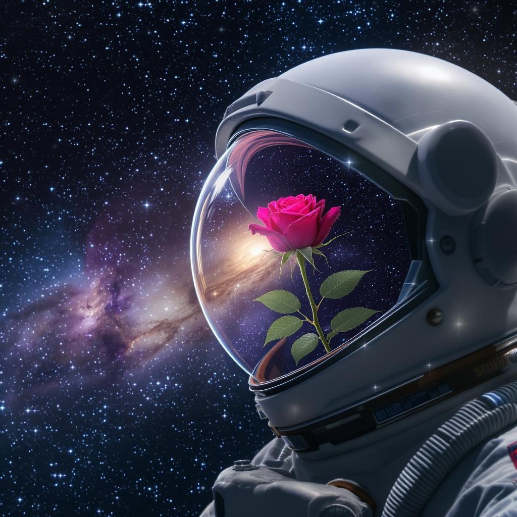 A vibrant rose growing within the open visor of an astronaut's helmet, drifting serenely through the boundless expanse of space, surrounded by a mesmerizing galaxy and ethereal nebula, with a breathtaking space backdrop, rendered in photorealistic 8k quality, featuring hyper-detail, captivating volumetric lighting, and HDR effects, evoking a sense of tranquility and wonder.