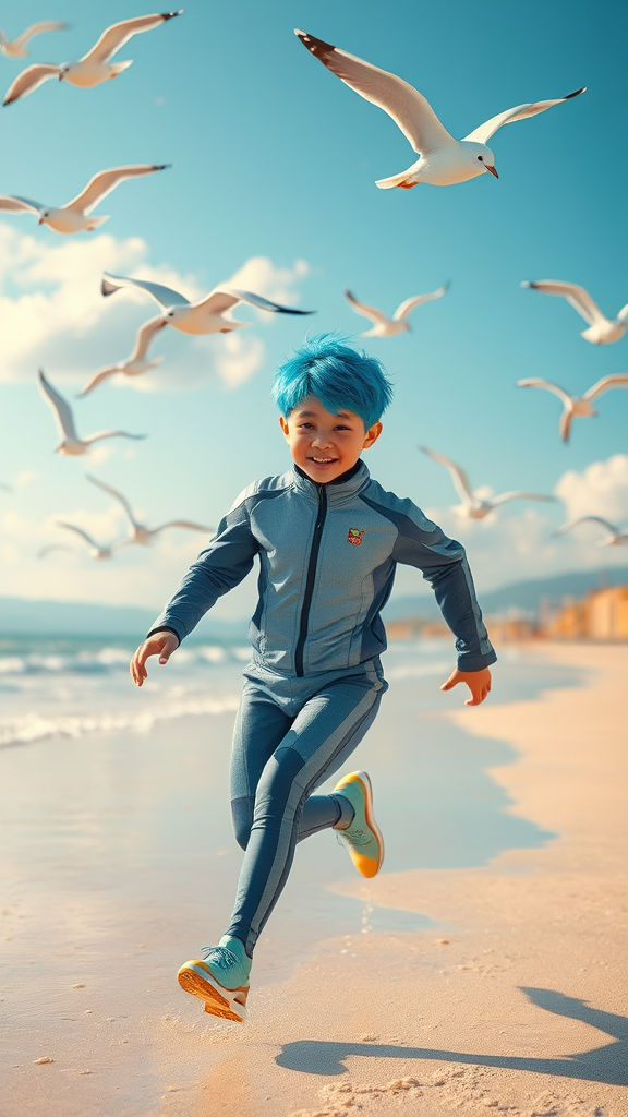 A vibrant scene captures a boy with vivid blue hair, clad in a sleek, technologically advanced suit that seamlessly morphs its appearance. He sprints joyfully along a virtual shoreline as AI-guided seagulls glide gracefully overhead. The ambiance resonates with Rinko Kawauchi's artistic touch, characterized by naturalistic poses and a relaxed, vacation dad-core vibe. His youthful energy is palpable, sporting a cool, confident expression amidst the cyberpunk-inspired setting. The sky is adorned with abstract flowers, blending into the surreal landscape. The image is reminiscent of dreamy lo-fi photography, meticulously detailed and infused with a kaleidoscope of colors. Captured with the nostalgic flair of analog film, it conveys a whimsical, ethereal quality, akin to being shot on a Fujifilm XT4, showcasing a raw, vivid aesthetic.