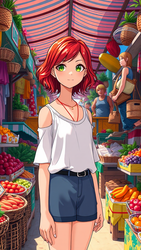 A vibrant scene features a single girl standing in a bustling market. She has striking, wavy short red hair that catches the sunlight. Surrounding her are colorful stalls filled with fresh produce and handmade goods, creating a lively atmosphere. Her confident stance and the vividness of the market make it feel like a masterpiece of everyday life.