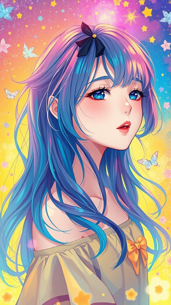 A vibrant scene featuring a girl with kaleidoscopic hair set against a lively, colorful background, reminiscent of Yanjun Cheng's captivating anime art style. The composition infuses fantasy elements, with ethereal figures weaving in and out of the imagery. The predominant hues of yellow and cyan interplay harmoniously, creating a soothing yet dynamic atmosphere. Enhanced with rainbowcore aesthetics, the artwork is rendered in 32k ultra-high definition, showcasing every exquisite detail and capturing the eye with its enchanting charm and whimsy.