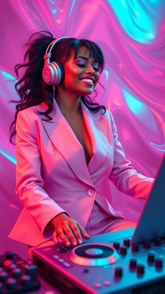 A vibrant scene featuring DJ Chickie in a pastel pink suit, joyfully absorbed in her music. An animated gif style infuses the image with dynamic movement and a playful energy, resonating with happycore vibes. Her feminine form is elegantly highlighted, while the atmosphere captures a sense of fluidity, as if painted in liquid metal hues. The setting is dreamlike, with hints of pigeoncore aesthetics blending seamlessly into the wavy, animated background. This visual narrative dances with a raw, unfiltered charm, inviting viewers into a whimsical, music-filled world.