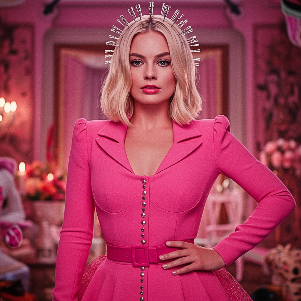 A vibrant scene featuring Margot Robbie in a surreal crossover, embodying both the elegance of Barbie and the dark allure of Hellraiser's Pinhead, dressed in a striking pink ensemble. The background is a blend of dreamlike whimsy and eerie gothic elements, with playful hints of both fantasy and mystery swirling around her, capturing a sense of both innocence and intrigue.