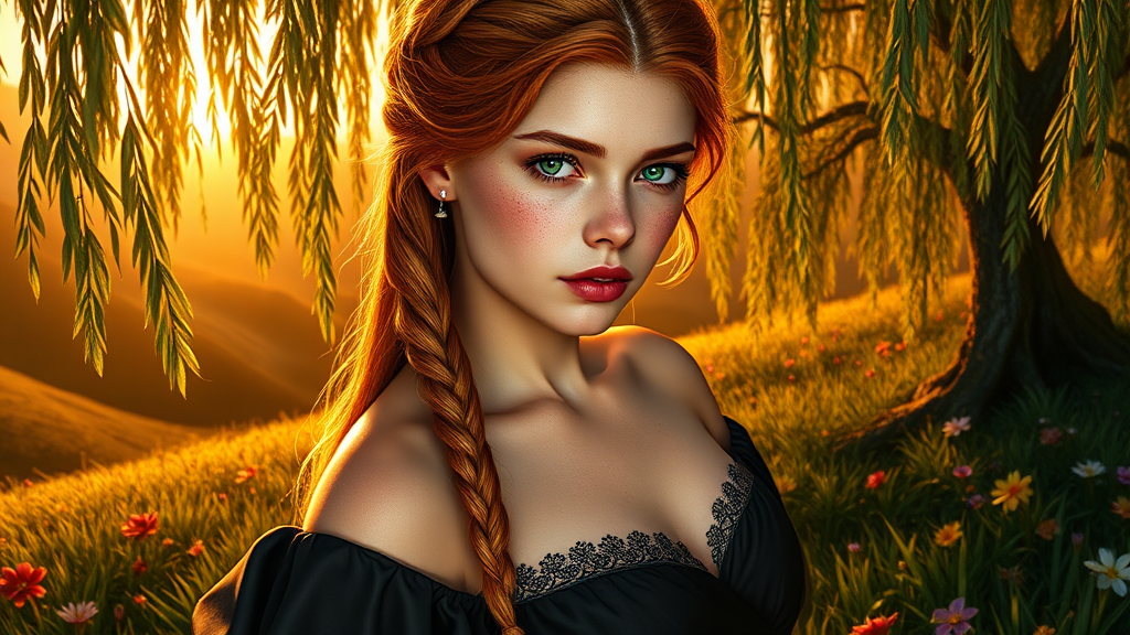 A vibrant scene focusing on a character with a detailed face, featuring sensual, messy ginger hair adorned with long braids, and sprinkled with freckles across a strong, square-jawed visage. Sharp features, high cheekbones, and heart-shaped lips highlight the face. Dressed in a long, dark, elegant, sensual gown, the figure boasts an hourglass silhouette with a large chest. Green eyes shine with intensity, set against a backdrop of dynamic golden-hour lighting. The setting is rich with fantasy elements; weeping willows sway above lush green grass dotted with colorful flowers, creating a stunning, hyper-detailed landscape. The style is a blend of intricate, elegant oil paintings and concept art reminiscent of Artgerm, Greg Rutkowski, Alphonse Mucha, and William-Adolphe Bouguereau. The scene is rendered with high-quality photo-realism in UHD, HDR, and 8K, capturing a zoomed-out, full-body view of this Lord of the Rings-inspired character, emphasizing their commanding presence and beauty.