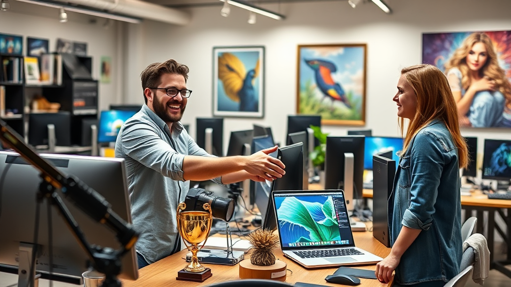 A vibrant scene in a bustling design studio, where a delighted customer is shaking hands with a skilled graphic designer. The studio is filled with high-end computers and laptops, showcasing various creative projects on their screens. A professional camera sits nearby, hinting at the studio's multimedia capabilities. On the wall, an art prize trophy gleams beside a stunning masterpiece. The atmosphere is energetic and collaborative, capturing the excitement of successful creative collaboration.