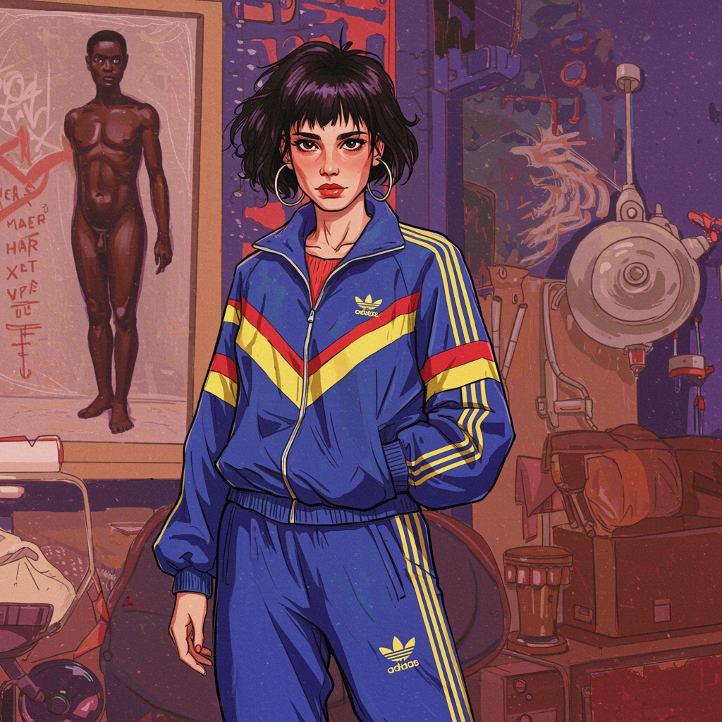A vibrant scene inspired by Jean Michel Basquiat features a cyborg girl in a vintage Adidas tracksuit, exuding a sporty and opulent 80s flair. The setting captures the essence of vintage photography, blending abstract elements with a sketch-like quality. In the backdrop, a juxtaposition presents a naked black man reminiscent of Manet’s works, adding a layer of historical art reference. The composition maintains a cartoonish undertone, intertwining abstract forms and unconventional shapes. Despite its intentionally rough and imperfect qualities, the art piece vividly brings to life an era of bold expression and eclectic style.