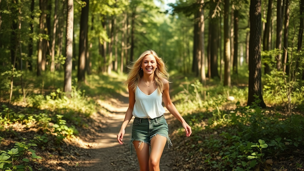 A vibrant scene of a blonde social media influencer lively exploring the forest trails on a bright, warm day. The sunlight filters through the trees, casting playful shadows on the leafy path. Her casual, stylish attire matches the natural tones around her, blending fashion with nature's palette. The ambiance is relaxed yet invigorating, capturing a spontaneous moment of joy and connection with the surrounding landscape.