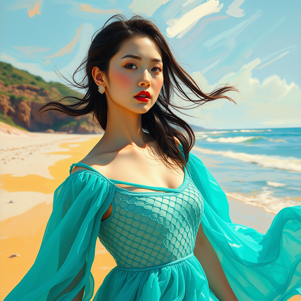 A vibrant scene of a Chinese woman in a flowing turquoise dress stands gracefully on the beach, capturing the ethereal elegance reminiscent of Botticelli's figures. Her features are strikingly styled like a high-fashion model, with an intricate netting subtly woven into her ensemble. The environment is painted in vivid, bright colors, reflecting the influence of Greg Broadmore, blending the natural beauty of the shoreline with a touch of surrealism. The edges of her form seem to blur slightly, suggesting a gentle disappearance into the surrounding artistry, creating a mesmerizing fusion of environment and figure.