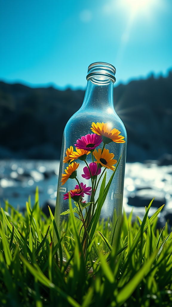 A vibrant scene of colorful flowers captured inside a clear glass bottle resting on lush green grass. The sunlight dances through the bottle, creating a striking interplay of light and shadows, set against a bright, clear blue sky typical of a sunny spring day. The overall composition is in sharp focus, showcasing a professional 8k UHD cinematic quality. In the background flows a dramatically intense and dark river, contributing to a tense and edgy atmosphere. The image maintains a sense of realism and high detail, with each element meticulously rendered in HDR CGI 3D. Despite these artistic choices, the scene avoids any visual flaws or distortions, presenting harmonious proportions and natural shapes without any surreal or deformed features. The composition seamlessly excludes any unwanted artifacts like text, user's marks, or disruptive elements, ensuring a visually appealing and cohesive image.