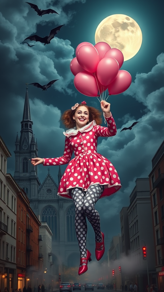 A vibrant scene portrays a joyful woman donned in a whimsical clown ensemble, exuding a generous spirit with her kind smile. Amidst the bustling cityscape, she floats gracefully, holding a bunch of pink balloons, her attire adorned with playful polka-dots and stylish leggings. The background reveals a majestic cathedral as its architectural centerpiece, while an ominous sky looms overhead. A luminous full moon casts an ethereal glow, silhouetted by the flight of mysterious bats. Volumetric fog snakes through the partially clouded midnight atmosphere, enhancing the dreamlike quality of the scene. Painted as though by Albert Bierstadt, the hyper-realistic oil painting captivates with its rich, intricate details and imaginative ambiance.