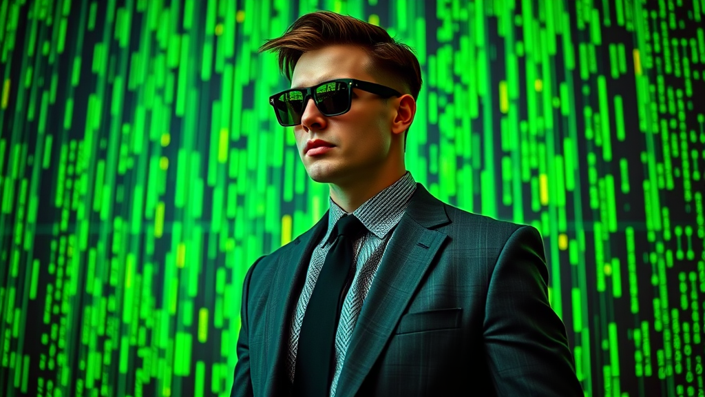 A vibrant sea of neon green digital code streams fluidly across an intricate matrix grid, creating a captivating cyberpunk tableau. In the midst of this technological tapestry stands a poised, sophisticated figure. Clad in a meticulously tailored charcoal gray suit, beneath which a crisp, silver-threaded shirt peeks, the ensemble is completed with a slender, midnight black tie. His features are partially veiled by elegant, reflective obsidian sunglasses that capture fleeting whispers of green code, exuding an enigmatic charm. The ambient lighting casts gentle neon green accents upon his form, subtly shaping his silhouette against the dynamic matrix canvas. This scene radiates a futuristic elegance, a blend of authority and mystery in a high-tech realm.