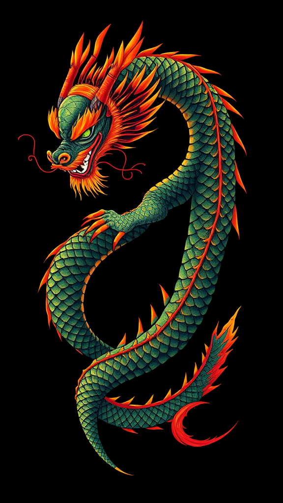 A vibrant, sinuous Chinese dragon, depicted in bold and graphic style, coils across a stark black background. Its scales shimmer in shades of dark green and amber, exuding an aura of ancient mystique. The creature's eyes glint with light green, while crimson accents dance along its mane and whiskers, adding an intense dynamism to its elegant form. It maintains a precarious balance, poised mid-motion as if caught between worlds. Inspired by the intricate artistry of Mark Brooks, this majestic beast embodies both power and grace.