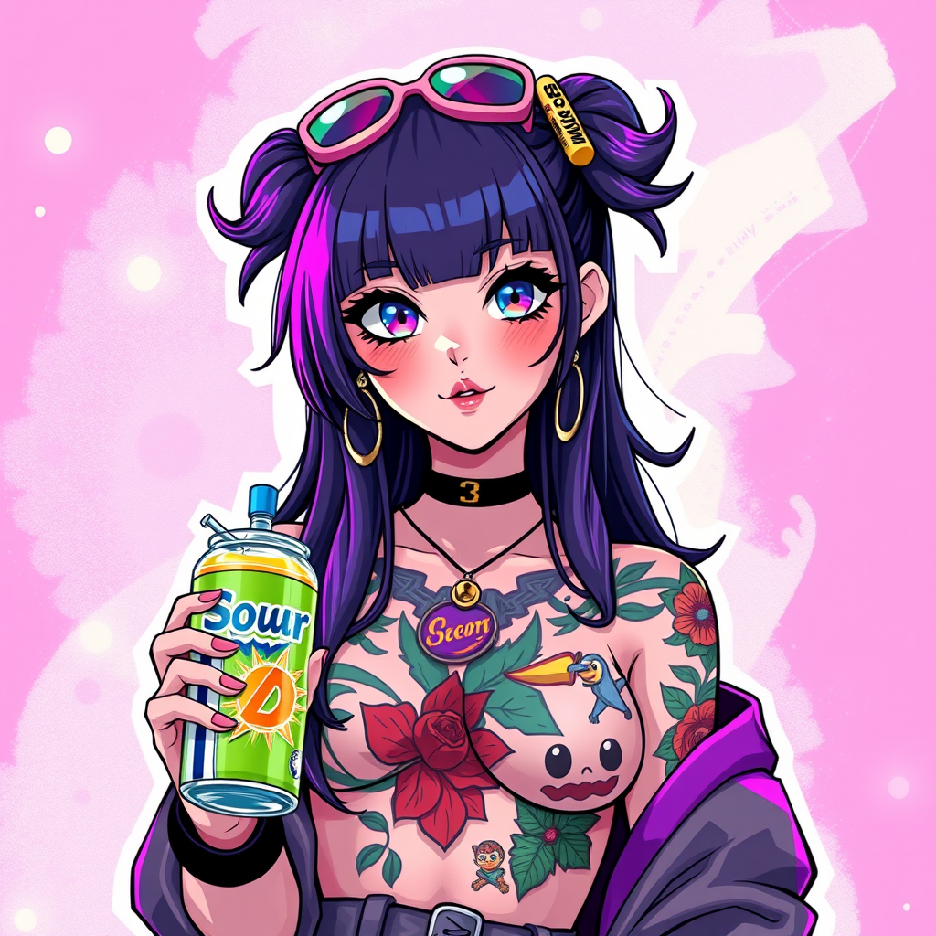 A vibrant soda-themed girl with a bold chest tattoo, holding a colorful energy drink, blending the whimsical charm of Loish's art style with the nostalgic flair of 80s and 90s anime aesthetics. Her look embodies candypunk character design, featuring bright, eye-catching colors and dynamic patterns. Her playful expression and lively fashion evoke the retro anime vibe, capturing the imaginative essence of a bygone era with a fresh and modern twist.