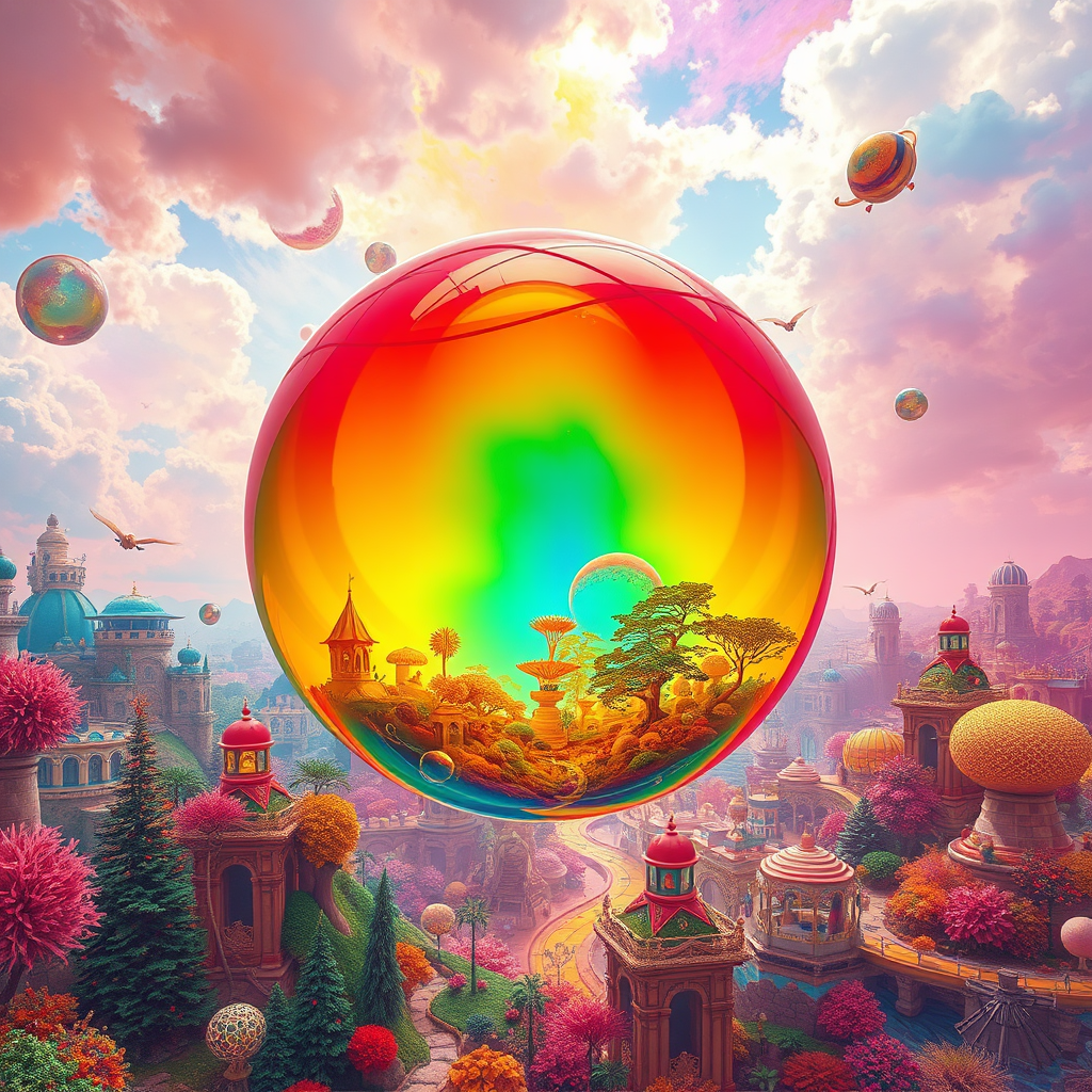 A vibrant sphere floats through the Colorverse, a realm where colors pulse and shimmer in their own unique harmonies, each hue narrating its own story. Inside Bubbleworld, whimsical landscapes of translucent structures and effervescent hues meld together. The sky is an ever-changing canvas of liquid rainbows, and the air hums with a living kaleidoscope of colors that dance around unseen winds. Rivers of liquid sapphire wind past forests of neon-tinted trees, while creatures of pure pigment flit about, leaving trails of iridescence. In this dynamic world, color isn’t just seen—it’s felt, heard, and tasted, creating an immersive symphony that thrives on the vivid energy of the Colorverse.