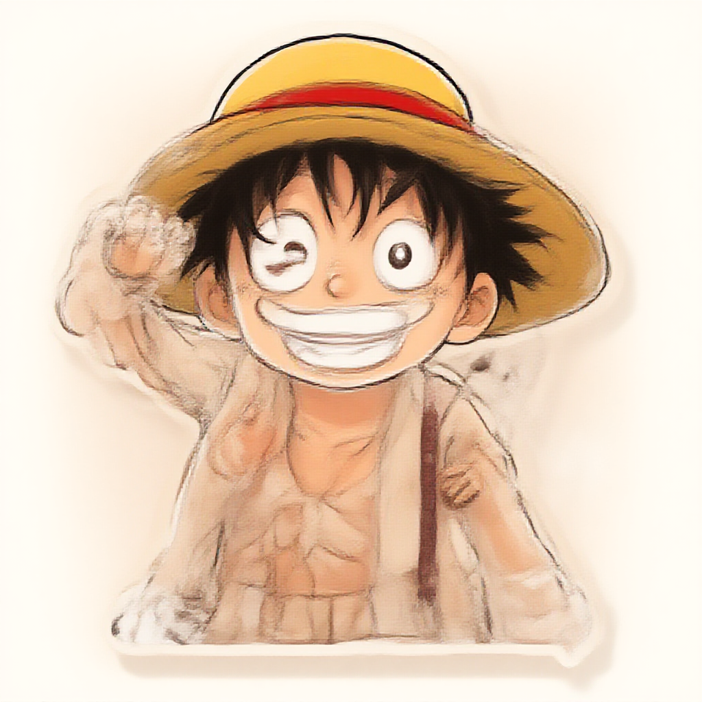 A vibrant sticker illustration of Monkey D. Luffy from One Piece, wearing his iconic straw hat with a joyful and triumphant expression, depicted in a minimalist anime style. The design captures the adventurous spirit and charisma of Luffy while incorporating subtle creative elements like dynamic pose or unique shading, making it suitable for trending on ArtStation. The art style leans towards a clean and modern aesthetic, emphasizing bold outlines and soft color palettes, embracing the adventurous and whimsical essence of the character.