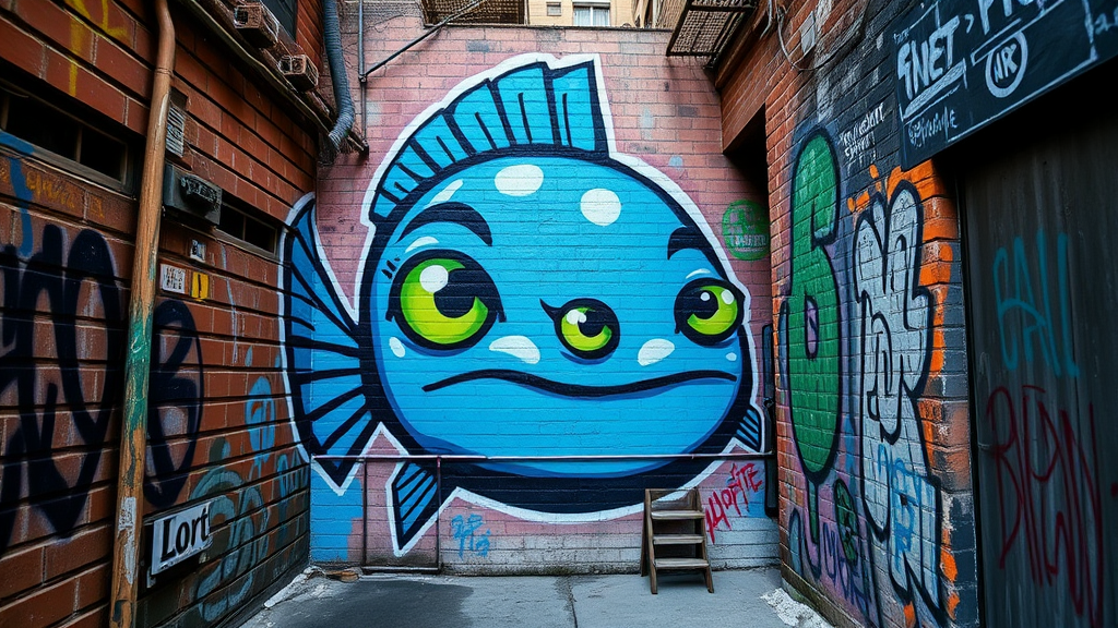 A vibrant street art piece in a New York City alleyway depicting an urban cartoon graffiti of a blue puffer fish with luminous green eyes, blending abstract elements and social commentary in a style reminiscent of Banksy, featuring a rugged brick background and hints of whimsical underwater themes amidst the urban decay, with splashes of colorful paint and sharp, bold lines, capturing a sense of playfulness and rebellion against the gritty cityscape.
