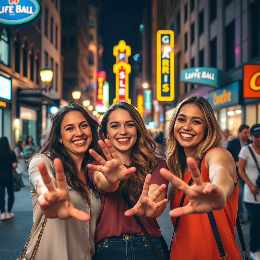 A vibrant street scene downtown featuring three women smiling under the city lights, their hands playfully reaching out to the lens. They stand against a backdrop of bustling sidewalks and glowing neon signs, their expressions full of joy and camaraderie. The warm streetlights cast a gentle glow, highlighting their colorful outfits and the city’s lively ambiance. The photograph captures the essence of urban energy and friendship, as if inviting the viewer to join their moment of spontaneity.