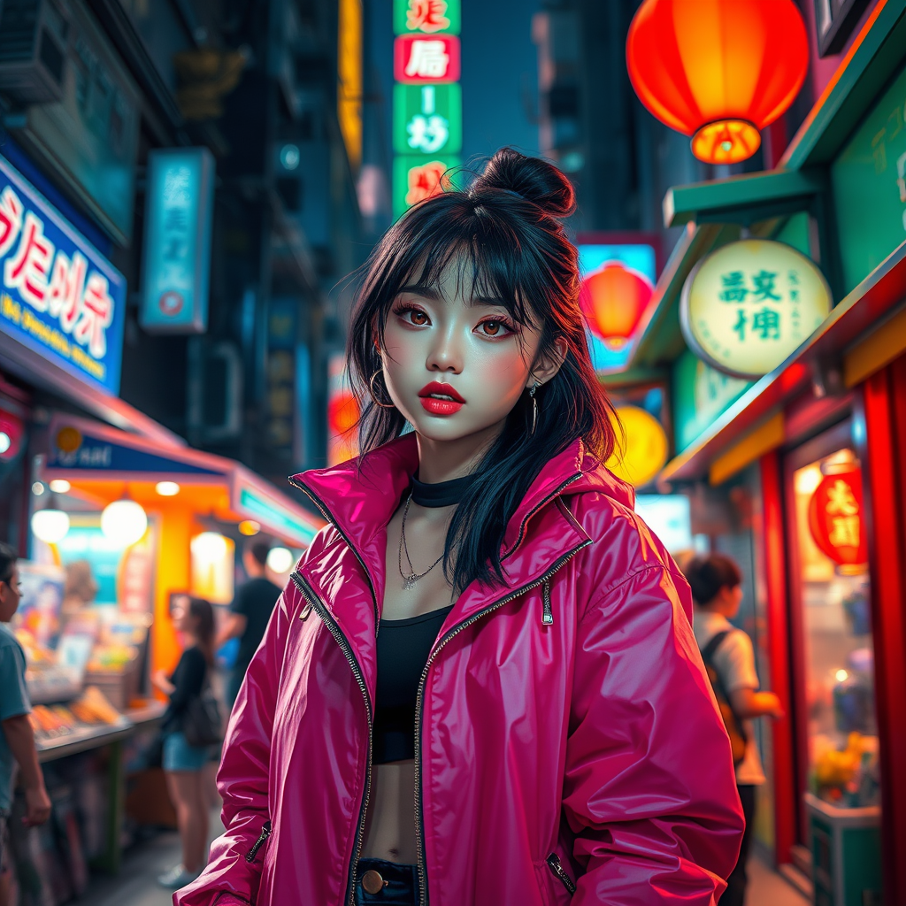 A vibrant street scene featuring a woman in a neon jacket, blending the gadgetpunk aesthetic with Ross Tran's charming anime style. The hyper-realistic details capture her confident pose amid bustling surroundings, with influences from Jessica Drossin and Hikari Shimoda evident in the intricate lighting and rich textures. The atmosphere is lively and colorful, reminiscent of a photograph taken with a Fujifilm X-T4 and Sony FE 85mm f/1.4 GM lens, emphasizing depth and clarity. The background is alive with street vendors and glowing city lights, enhancing the dynamic yet intimate feel of the scene.