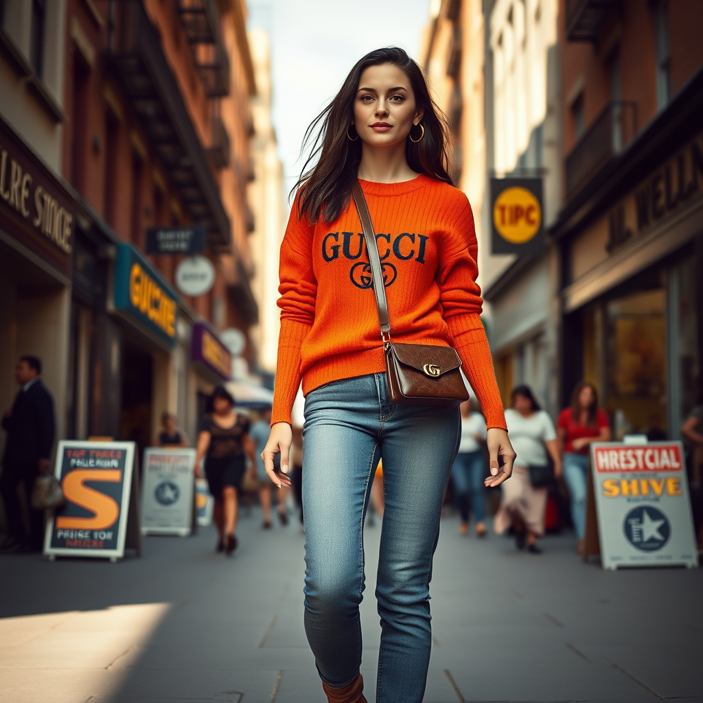 A vibrant street style photo captures a young woman confidently walking through the bustling streets of Soho, wearing a striking orange Gucci sweater paired with chic high-waisted jeans. Her outfit is complemented by stylish ankle boots and a sleek leather crossbody bag. The natural lighting of the midday sun casts a warm glow, highlighting the texture of her sweater and the bustling energy of the city around her. Shot on Agfa Vista 200 film, the image boasts rich colors and a crisp 4k resolution, capturing every detail of her ensemble. The surrounding urban landscape, with its eclectic mix of vintage storefronts and modern architecture, provides an engaging backdrop, perfectly framing the subject in a 16:9 aspect ratio.