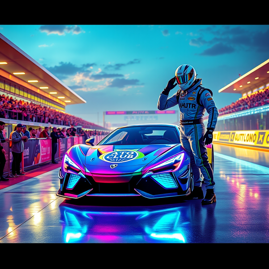 A vibrant summer day envelops the fluorescent-lit race track as the neon-emblazoned car sits gleaming under the intense glow. Its bold, iridescent auto club logo pulses with electric colors amidst swirling, digital patterns. Adjacent to the vehicle stands a cybernetic racing driver, his visor reflecting a spectrum of holographic hues while he secures his helmet with one hand, and with the other, sends a digital wave out to the adoring crowd. The driverless, helm-free cockpit remains a mystery, resonant with anticipation. Enthralled spectators, cloaked in cyberpunk fashion, eagerly line the stands and hover behind holographic barriers, their expressions shimmering in flickering light. The camera captures the scene from a futuristic vantage point, casting angular shadows across the landscape as it sweeps in from above, capturing the dynamic blend of human and technology.