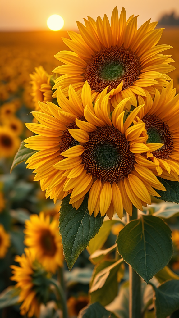 A vibrant sunflower bouquet with intricate detail, set against a vast and expansive sunflower field that stretches to the horizon, captured with a shallow depth of field to create a dreamy blur in the background. The portrait is illuminated by cinematic lighting, casting a warm, golden glow across the scene. The hyper-realistic details of the sunflowers are striking, showcasing their textured petals and vivid colors, while the setting sun enhances the masterpiece with its gentle rays, emphasizing the lush greens and rich yellows of the field in remarkable 8K clarity.