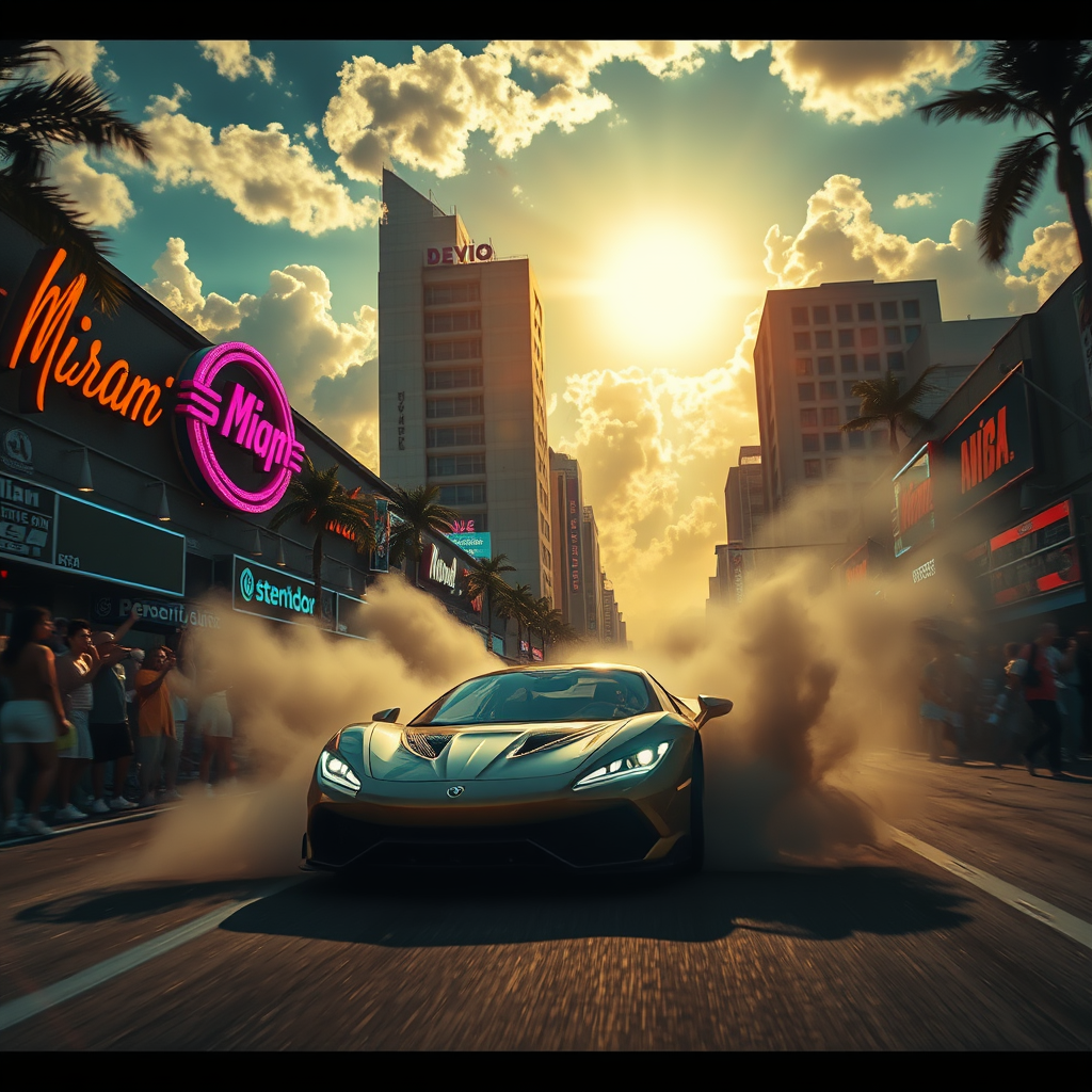 A vibrant sunny day casts golden hues over a stunning cloudy sky as a sports car speeds through the cyberpunk streets of Miami. Neon signs illuminate the scene, with crowds cheering amidst swirling confetti. Dust and wind whip through the air, merging with pulsating volumetric fog to enhance the thrilling, epic atmosphere captured in dynamic, action-packed camera shots.