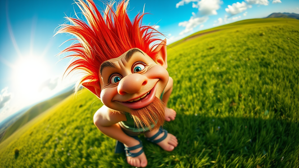 A vibrant, sunny day unfolds across a rolling grassy landscape, where a playful troll poses for a portrait. The exaggerated curvature of a fisheye lens captures the scene, enhancing the troll's quirky features. The lush green hills in the background bask in bright, vivid colors, and the troll's mischievous expression adds an element of whimsy to the cheerful atmosphere.