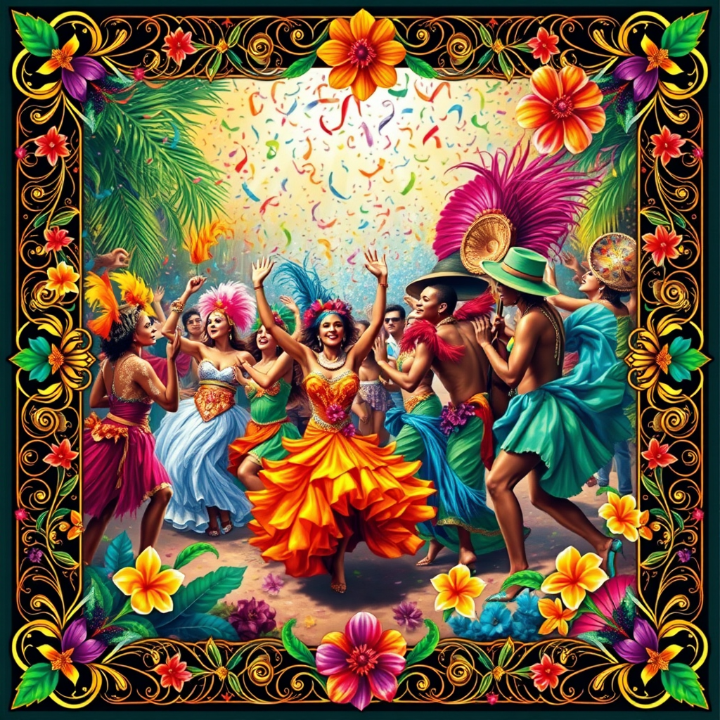 A vibrant tapestry of colors and patterns inspired by the Brazilian Carnival, featuring an exuberant display of dancers and musicians in flamboyant costumes. The background is a riot of confetti and streamers, with tropical flowers and feathers accentuating the lively scene. The composition is framed by intricate decorative borders that echo the rhythm and energy of samba, capturing the essence of joy and celebration in a tall, dynamic format.