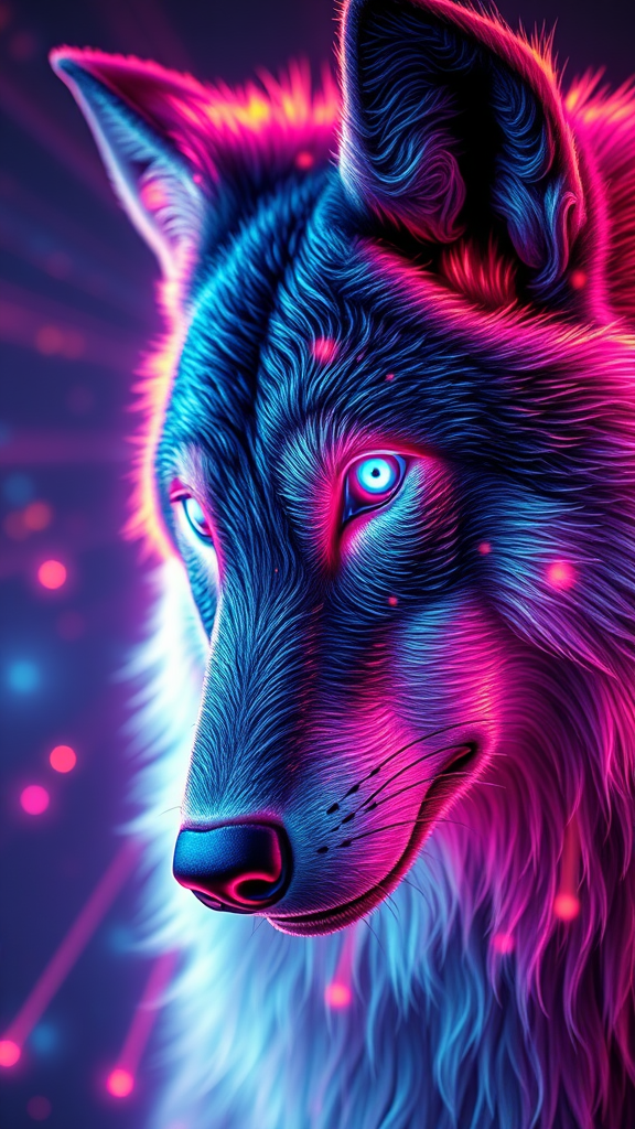 A vibrant, ultra-detailed close-up of a wolf crafted from neon rays, showcasing fairy lighting and photorealism, featuring bright, dynamic colors and volumetric light beams, captured in an hdr style, with dimensions 9:16.