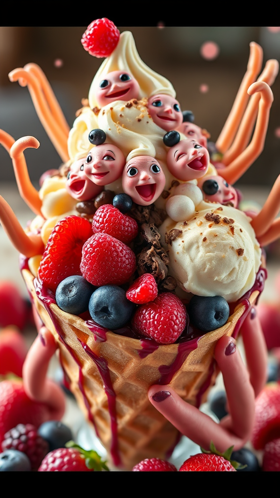 A vibrant, ultra-high-definition depiction of a scrumptious ice cream sundae nestled in a waffle cone bowl, adorned with a medley of fresh berries and an array of decadent toppings. The scene bursts with surreal elements: a whimsical touch of absurdity with cloned faces smiling from the berries, long necked creatures peeking out, and hands with extra fingers playfully reaching for the toppings. Despite the delightful chaos, the composition maintains a dreamy quality with no discernible distractions like logos or text, allowing the fantastical dessert to remain the star of this visually engaging narrative.