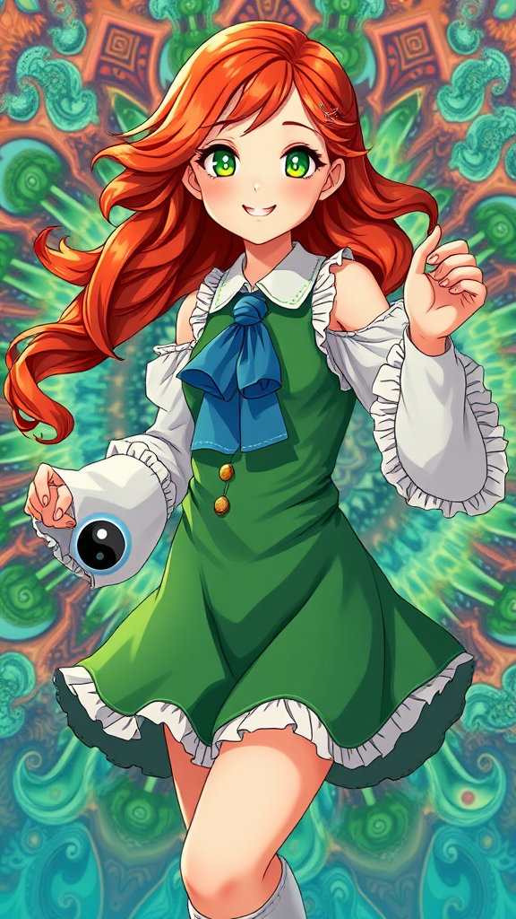A vibrant, ultra-realistic scene featuring fractal art in the background, showcasing a joyful girl with wavy, red-auburn hair and sparkling green eyes. She is gracefully dancing, exuding happiness. The vector-style artwork emphasizes her solo presence, adorned with a blue ascot and frilled shirt collar. Her attire includes a green vest and skirt, with bare shoulders highlighted by detached, wide sleeves. Her expression is warm, with a gentle smile and adorned with blush. The ensemble is complete with a full-body view, frilled petticoat, kneehighs, and long socks. The girl is holding a yin yang orb, its mystic energy casting a shadow. Attention to detail is evident in her flat chest, frilled hair tubes, and the vivid colors of the scene. The unity of the composition, in 8k UHD HDR quality, ensures a masterpiece of striking vividness and extreme detailing. Every aspect suggests a serene balance, avoiding any mutations or distortions, with all elements cohesively framed for a captivating, high-quality visual experience.