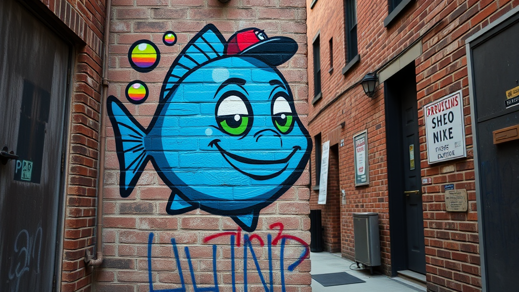 A vibrant urban cartoon graffiti depicts a mischievous blue puffer fish with striking green eyes, sporting a cheeky grin, painted in a style reminiscent of Banksy on a rugged brick wall in a bustling New York City alleyway. The fish wears a tiny red cap tilted to one side, while bubbles in rainbow hues float around it, adding a playful splash of color. The artwork captures the essence of the city's dynamic street art culture, merging whimsy with the gritty charm of its surroundings.