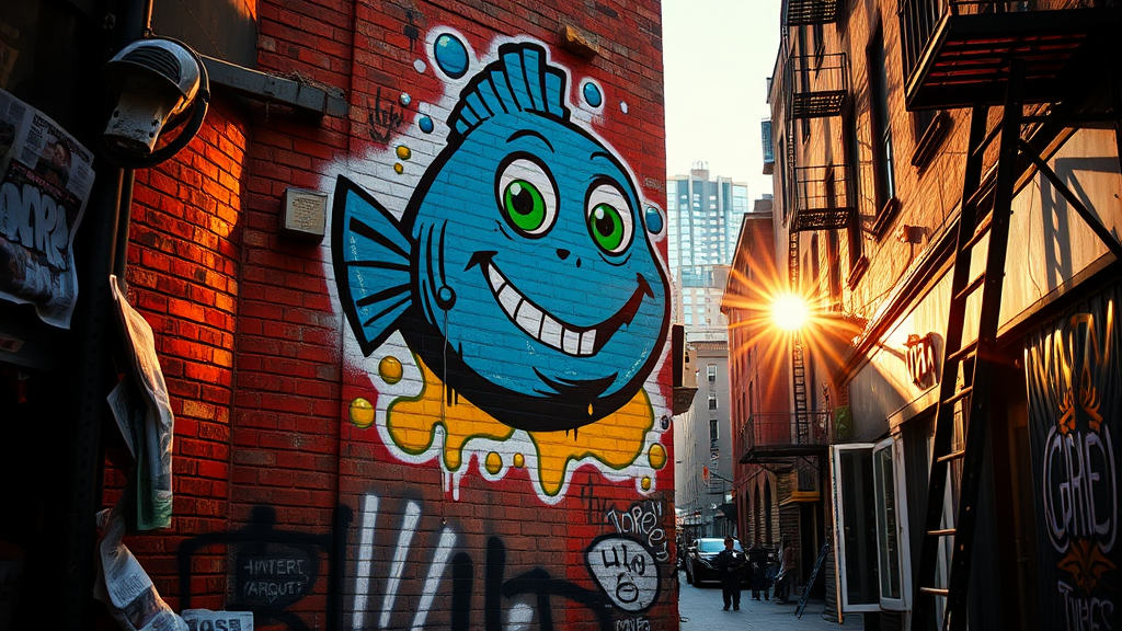 A vibrant urban graffiti piece depicting a whimsical blue puffer fish with striking emerald green eyes, rendered in the iconic Banksy style, graces the weathered brick wall of a bustling New York City alleyway. The puffer fish appears to be wearing a cheeky grin, with graffiti elements like splashes of yellow and intricate stenciled bubbles surrounding it. The setting sun casts dramatic shadows across the artwork, enhancing its depth and character. Bits of urban detritus like discarded newspapers and a rusty fire escape ladder frame the scene, adding to the gritty, authentic feel of the cityscape.