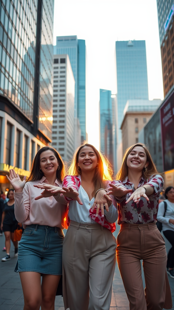 A vibrant urban scene captures three women in a lively downtown street, their hands playfully reaching out towards the camera, their smiles bright against the backdrop of towering city structures. The evening sun casts a golden glow, reflecting off the glass buildings, as they stand amidst a bustling crowd, each person lost in their own rhythm. Their colorful outfits contrast artistically with the grayscale tones of the surroundings, adding a sense of joyous dynamism to the moment.