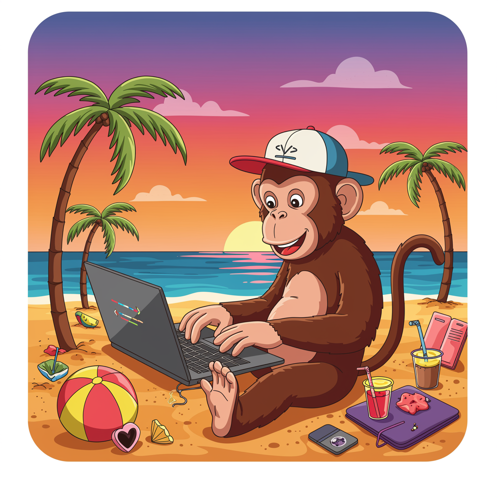 A vibrant vector illustration of a cheerful monkey wearing a funky cap, passionately typing away on a sleek laptop at a sun-drenched beach, surrounded by palm trees and colorful beach toys, as it skillfully codes innovative AI applications amidst a stunning, multi-hued sunset.