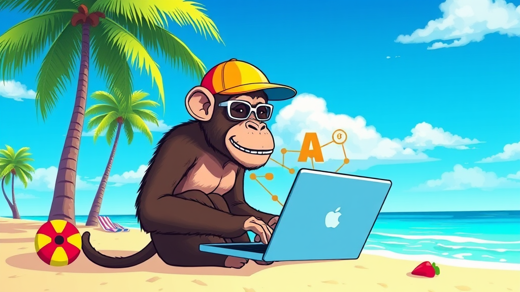 A vibrant vector illustration of a monkey wearing a bright cap, sitting on a sunny beach with a laptop, diligently coding innovative AI applications, surrounded by palm trees and colorful beach elements.