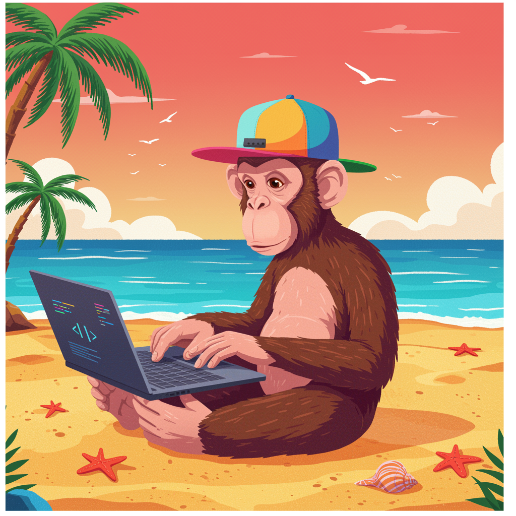 A vibrant vector illustration of a monkey wearing a colorful cap, sitting on a sandy beach with the ocean in the background. The monkey is focused on a sleek laptop, skillfully coding AI applications, surrounded by a lively palette of bright, tropical colors, with elements like palm trees and seashells adding to the cheerful beach atmosphere.