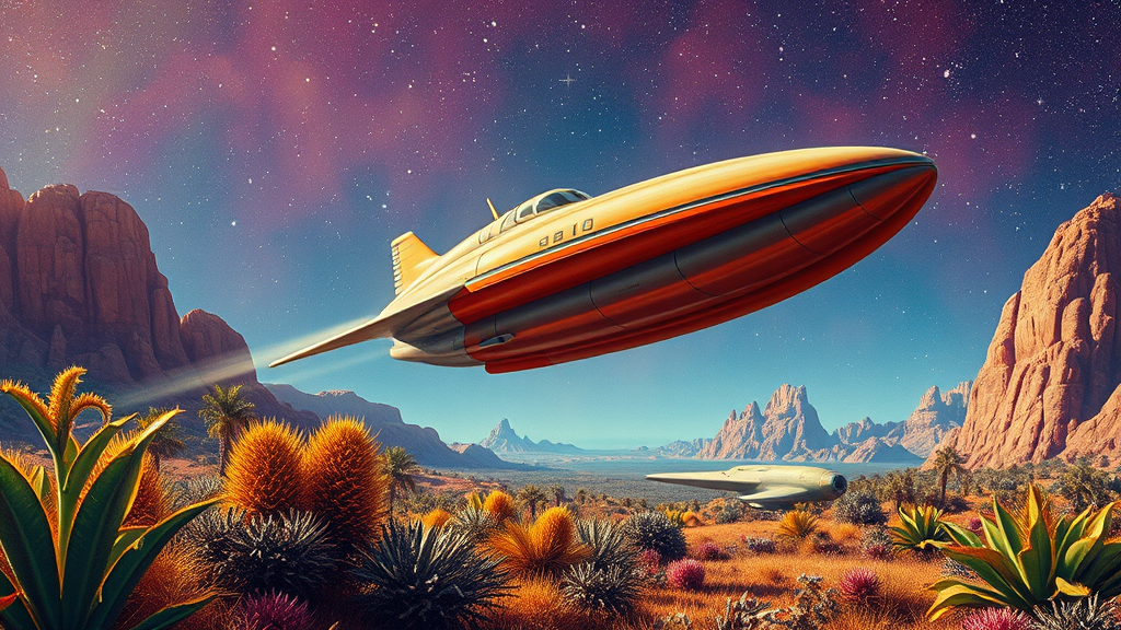 A vibrant, vintage-inspired scene of 1950s science fiction space travel, showcasing a sleek, retro spacecraft with smooth, aerodynamic lines hovering above a lush, alien landscape filled with colorful, exotic vegetation under a vivid, starry sky. The view captures the wonder and excitement of space exploration from ground level, using the rich colors and textures reminiscent of Bruce Pennington's artwork captured with a Kodak Master View 8x10 camera, complemented by the distinctive clarity of a Fujinon C 240mm f/9 lens on Kodak Ektar 100 film.
