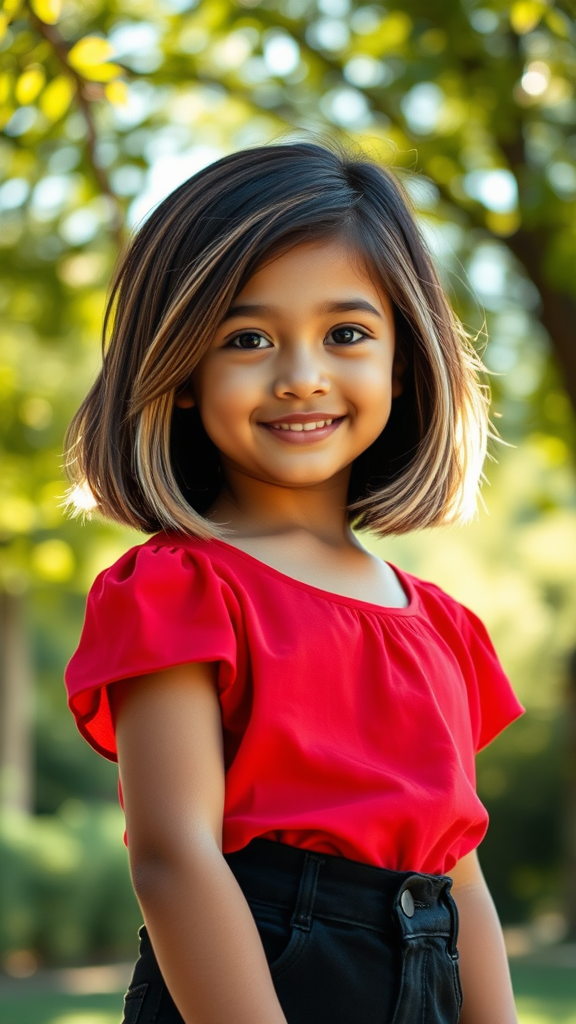 A vibrant waist-up portrait of a young, beautiful girl of diverse ethnic backgrounds, exhibiting a radiant and natural complexion. Her medium-length bob haircut features a stunning combination of brunette with subtle blonde accents. Clad in a stylish red blouse that adds a pop of color, paired with black jeans, she stands confidently in a serene outdoor setting, where the sunlight dances through the leaves, casting gentle shadows that complement her lively expression.