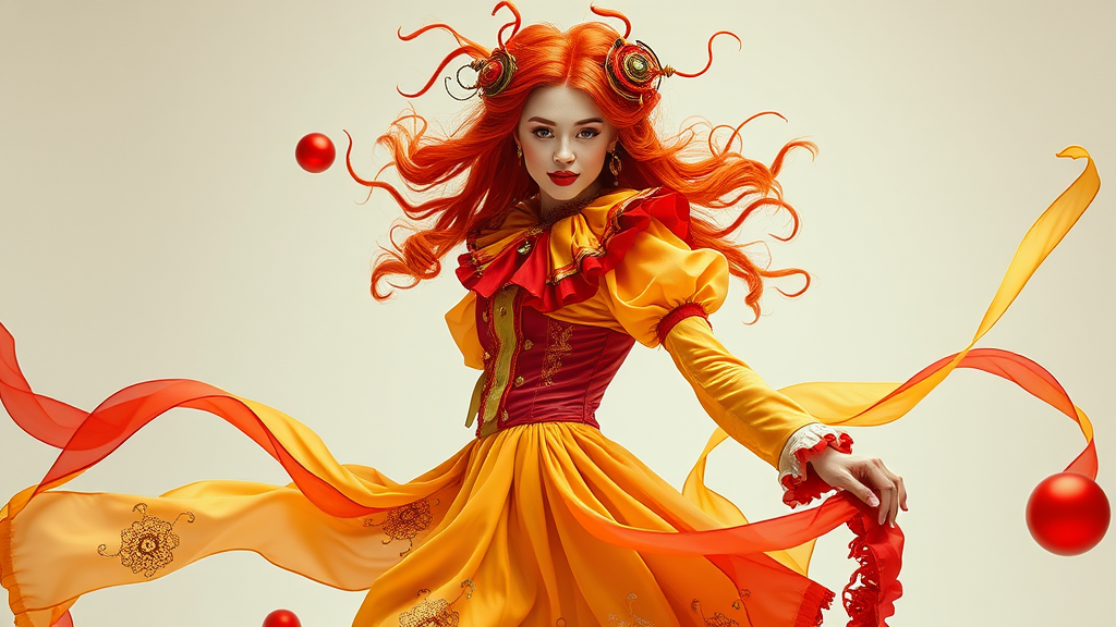 A vibrant, whimsical woman with fiery red hair embodies the essence of a magical girl with a playful clown twist. Her stylish costume is an enchanting fusion of light yellow and dark crimson hues, adorned with elegant pencilsteampunk details. A sense of kintsukuroi artistry is woven throughout her outfit, creating a delicate dance of gold accents across fluid, flowing fabrics that shimmer with every movement. The design captures the essence of a colorful moebius, intertwining elements that evoke a sense of wonder and fantasy. She moves with a graceful confidence, her outfit an eclectic mixture of loose and form-fitting elements, balancing spontaneity with a meticulously crafted aesthetic that transforms her into a living work of art.
