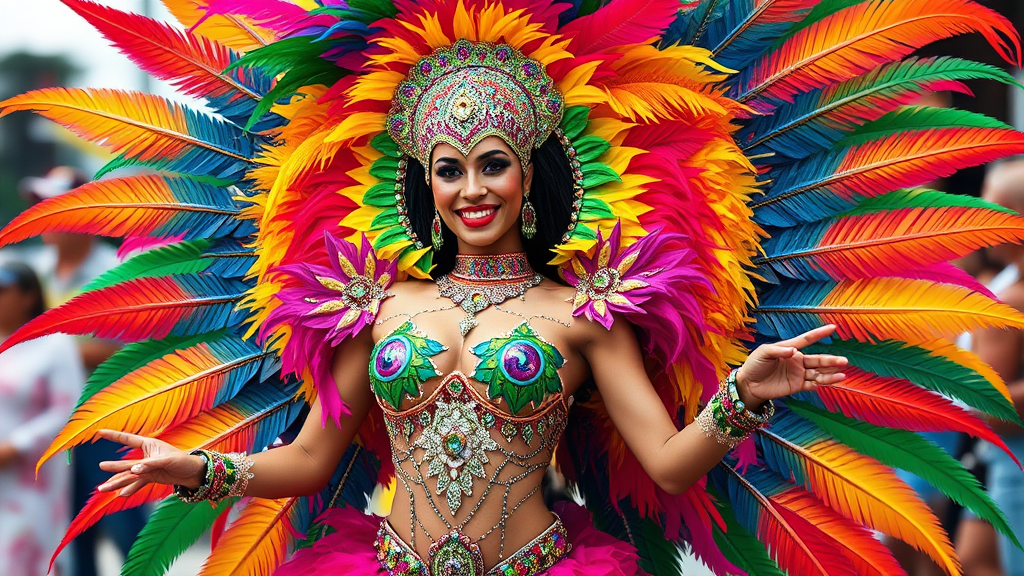 A vibrant woman from Brazil, adorned in a dazzling carnival outfit, her body embellished with vivid feathers and shimmering sequins, radiating an infectious energy and joy. Her ensemble is a riot of colors, each hue adding to the swirling festivity, as she moves with grace and exuberance. The intricate patterns of her attire and body art capture the essence of celebration, her smile and lively movements drawing everyone into the jubilant spirit.