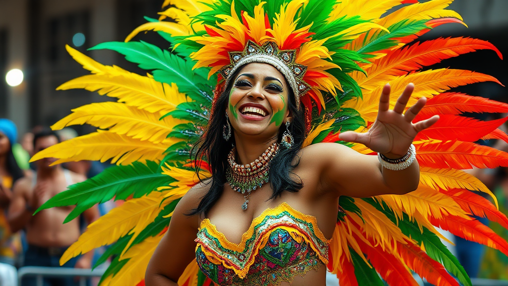 A vibrant woman from Brazil, radiating enthusiasm, adorned in a stunning carnival ensemble bursting with vivid feathers and sequins. Her skin is artistically painted, reflecting the lively spirit of the celebration. Her energetic dance movements are captivating and joyfully infectious. The scene is alive with color and vitality as she embodies the excitement and festivity of the carnival atmosphere. Her expressive features and graceful motions create an aura of happiness and exuberance.