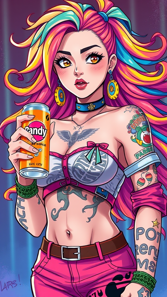 A vibrant woman with a striking tattoo on her chest holds an energy drink confidently. Her soda-themed attire bursts with bright colors and bold patterns, embodying a playful candypunk character design. Her appearance merges the expressive grace of a loish art style with the nostalgic flair of 80s and 90s anime aesthetics. Her hair, adorned in dynamic hues, flows like a cascade of candy. The scene exudes an enticing 80s anime vibe, capturing a perfect blend of retro and modern elements.