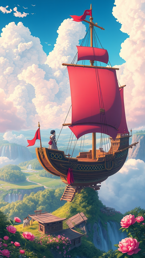 A vibrant world of whimsical fantasy, a studio ghibli-esque landscape unfolds with lush gardens and tranquil valleys. In this enchanting realm, a 19-year-old daughter of noble lineage, the Rose-Colored Heiress, embarks on a journey aboard the Crimson Peony, a majestic skyship. Her eyes, a mesmerizing shade of rose, mirror the vibrant hues of her lineage. As she sails through sea-like clouds, her adventurous spirit unveils secrets and stirs the winds of fate in a world where magic blooms and dreams take flight.