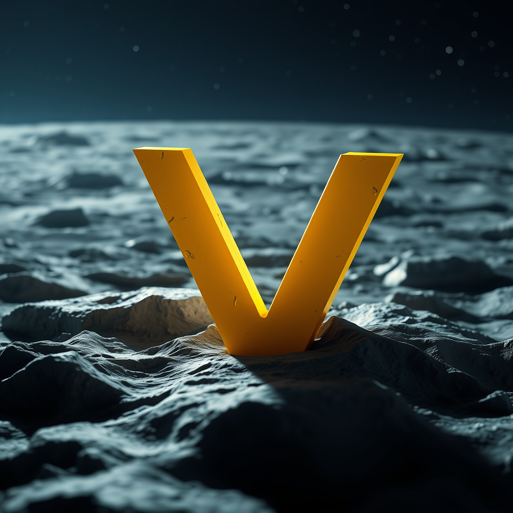 A vibrant yellow letter V stands majestically on the lunar surface, surrounded by the vast expanse of space. The scene is captured in ultra-realistic 3D render, highlighting the intricate textures of the moon's rugged terrain. Cinematic lighting bathes the V in a soft, ethereal glow, casting subtle shadows that add depth and drama to the composition. In the background, distant stars twinkle against the endless darkness, creating a mesmerizing cosmic backdrop. The letter’s surface appears slightly weathered, as though it has withstood the elements, adding to the scene's sense of timeless wonder and exploration.