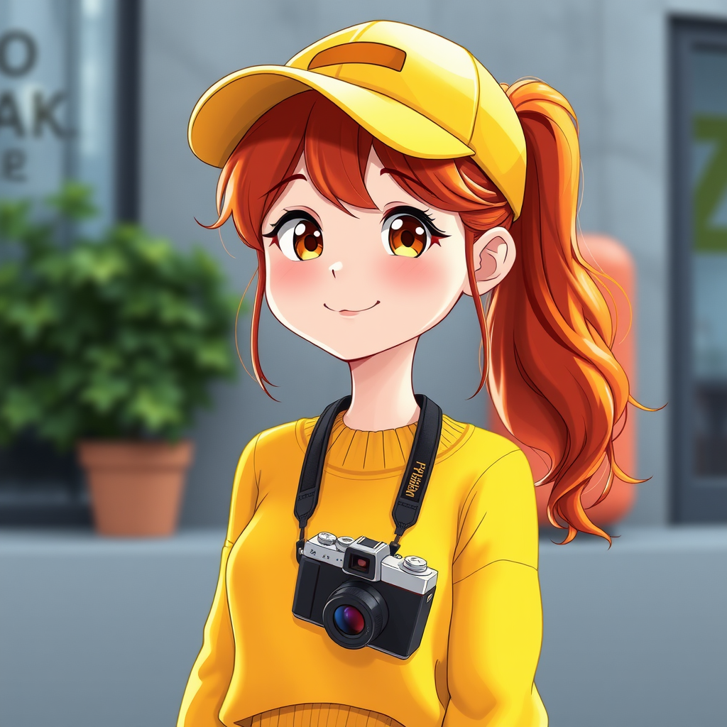 A vibrant young adult in her mid-twenties with striking ginger hair stands confidently, a camera slung around her neck. She's wearing a cheerful yellow jumper and a matching baseball cap that perfectly complement her lively personality. The character design carries the essence of Kentaro Miura's style, with intricate details and expressive features. In a stunning 3D CGI form, the character is set in beautiful natural, volumetric lighting that enhances her vivid appearance. The rendering showcases an adorable yet dynamic character, combining elements of cartoon and anime with an illustrative flair. The digital painting boasts sharp, well-defined features that reflect a sense of realism and charm, avoiding any negative qualities like distortion or poor anatomy. The overall composition is crisp, high-quality, and artistically styled, ensuring the character is beautifully crafted without any imperfections.